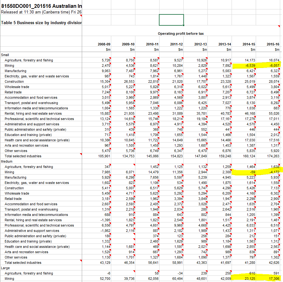 Operating profit before tax by Australian Industry- the entire small and medium mining industry collectively has been loss making from 2014–16 on an operating basis. Source: Australian Bureau of Statistics