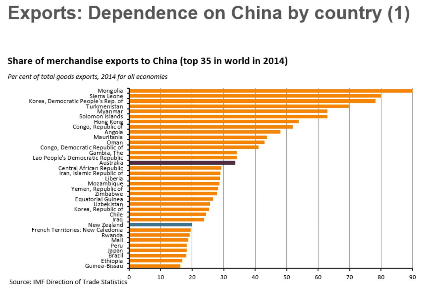 Out of all OECD nations, Australia is the most dependent on China by a huge margin, according to the IMF. Over one third of all merchandise exports from this country go to China- where ‘merchandise exports’ includes all physical products, including the things we dig out of the ground.